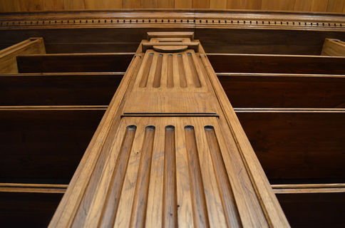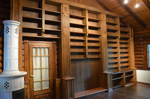 Реставрацией в чистом виде это назвать нельзя, но так как у нас художественно-реставрационная мастерская, назовём это именно так. Мебель библиотеки, а именно стеллажи, каркас и декоративные элементы фасада, была абсолютно новая, только что изготовленная. Наша задача заключалась в тонировании дуба с точным попаданием в цвет остальной мебели дома, а также в состаривании дубовых фасадов стеллажей.