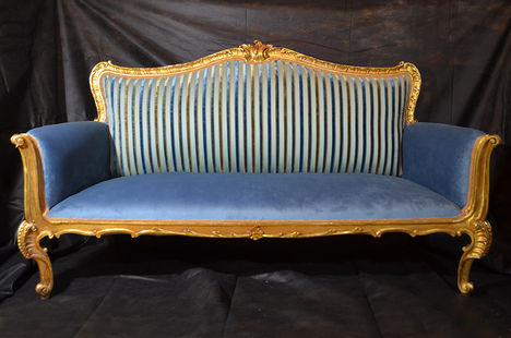 Несмотря на кажущуюся внешнюю целостность, диван был в крайне плачевном состоянии. Древесина почти полностью съедена жуком-точильщиком. Вся конструкция держалась в основном на левкасе и позолотном слое. Но при первейшем прикосновении становилось ясно: работы очень много не только внешне-косметической, но и с укреплением конструкции и с подведением клеевого состава внутрь элементов. И в связи с состоянием древесины особо остро стоял вопрос о перетяжке дивана, ведь для того чтоб натягивать и закреплять ткань, необходима основа, в которую вбивать гвоздики (или скобы), а здесь эта основа отсутствовала, ибо труха под позолотой проминалась даже от небольшого нажатия пальцем. Но ничего, сделали! И конструкцию укрепили, и позолоту восстановили, и ткань перетянули, и даже подушки сшили со съёмными чехлами на молнии и кантом в двух плоскостях, сделанным из той же ткани, что и обивка дивана.