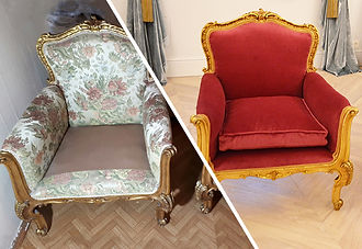 Реставрация старинной европейской мебели. Французские кресла XVIII века. Укрепление конструкции, восстановление орнамента и позолоты, перетяжка в новую ткань – бархат, изготовление подушек со съёмными чехлами на молнии и кантом из той же ткани в двух плоскостях.