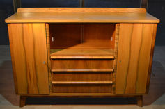 Реставрация серванта. Была произведена полная зачистка поверхности от старого лакового покрытия, частично удалён шпон, не поддающийся восстановлению, проведено укрепление конструкции, выравнивание поверхностей, шлифовка, устранены сколы и потёртости. На столешнице и других элементах серванта положен новый шпон. Произведены тонировки и покрытие лаком. Изготовлены стёкла для центральной части.